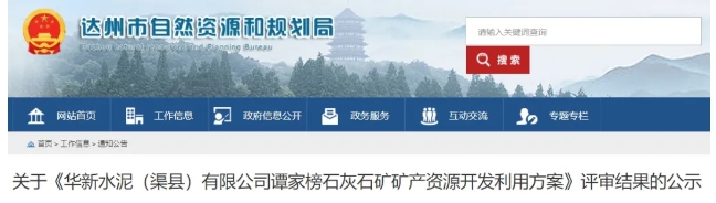 近日,四川省達州市自然資源和規(guī)劃局發(fā)布關于《華新水泥(渠縣)有限公司譚家榜石灰石礦礦產資源開發(fā)利用方案》評審結果的公示。