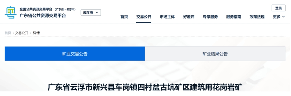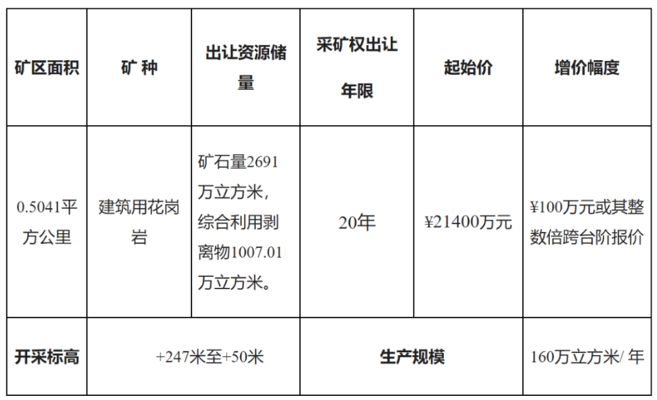 6月18日,廣東省公共資源交易中心發(fā)布廣東省云浮市新興縣車崗鎮(zhèn)四村盆古坑礦區(qū)建筑用花崗巖礦權(quán)出讓公告。該礦權(quán)建筑用花崗巖礦開采儲量為2691.00萬立方米,剝離物綜合利用995.84萬立方米,年產(chǎn)160萬方(約480萬噸)。起始價為21400萬元,還另需支付1.06億其它費用。
