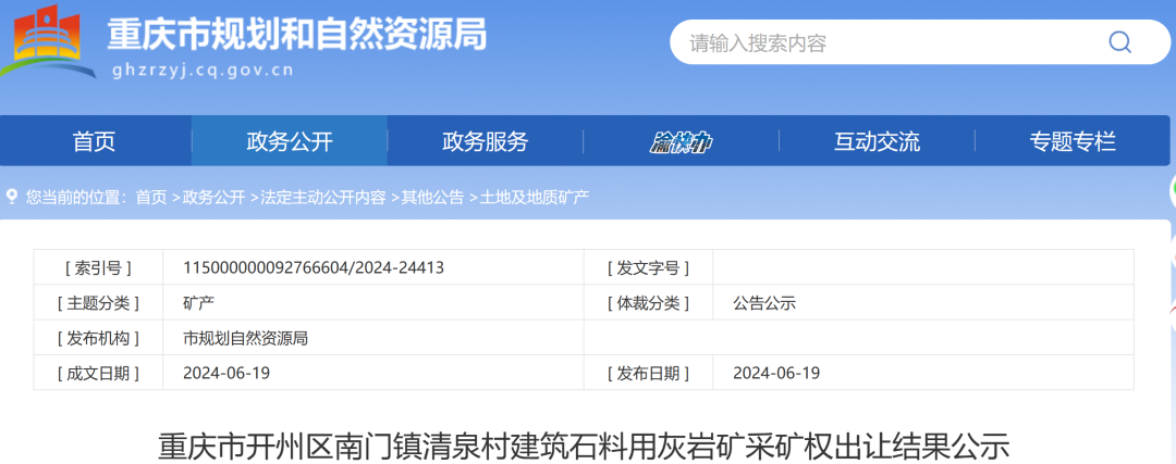 6月19日,重慶市規(guī)劃和自然局發(fā)布重慶市開州區(qū)南門鎮(zhèn)清泉村建筑石料用灰?guī)r礦采礦權(quán)出讓結(jié)果公示。該礦資源儲量630.4萬噸,生產(chǎn)規(guī)模100萬噸/年,出讓年限5.2年,起始價2005萬元,成交價為10500萬元,溢價率超400%。