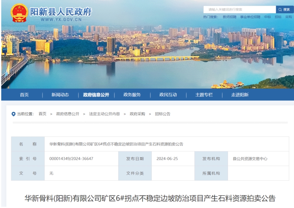 14.96元/噸!華新(陽新)億噸骨料項目出售52335噸石料