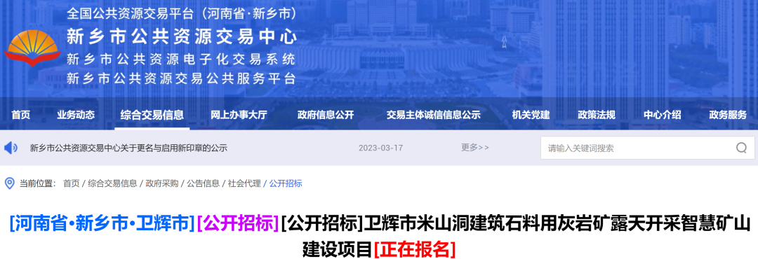衛(wèi)輝市米山洞建筑石料用灰?guī)r礦露天開采智慧礦山建設項目招標公告