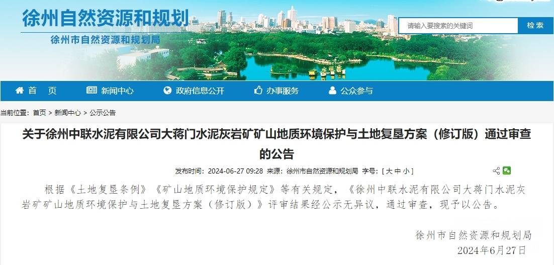根據(jù)《土地復(fù)墾條例》《礦山地質(zhì)環(huán)境保護(hù)規(guī)定》等有關(guān)規(guī)定,《徐州中聯(lián)水泥有限公司大蔣門水泥灰?guī)r礦礦山地質(zhì)環(huán)境保護(hù)與土地復(fù)墾方案(修訂版)》評審結(jié)果經(jīng)公示無異議,通過審查,現(xiàn)予以公告。