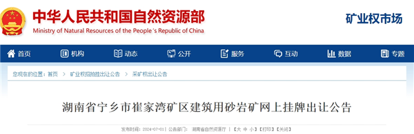7月1日,自然資源部發(fā)布湖南省長沙市寧鄉(xiāng)市崔家灣礦區(qū)建筑用砂巖礦采礦權(quán)掛牌出讓公告。該礦為凈礦出讓,資源儲量破億噸,出讓年限21.5年,生產(chǎn)規(guī)模500萬噸/年左右,起始價5.3億元,“凈礦”出讓成本4335.33萬元,每噸成本近5.5元。
