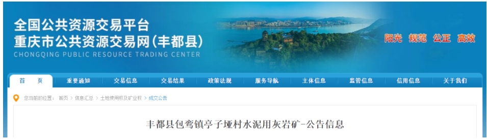 近日,重慶市豐都縣包鸞鎮(zhèn)亭子埡村水泥用灰?guī)r礦采礦權被中國砂石協(xié)會常務理事單位——東方希望重慶水泥有限公司以68803萬元的底價拍得。該礦權資源儲量26260.60萬噸,生產(chǎn)規(guī)模:2000萬噸/年,出讓年限17年,單價為2.62元/噸。
