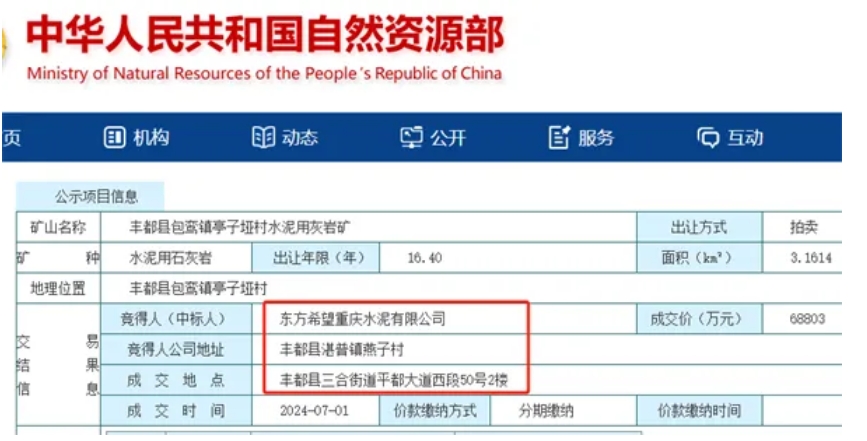 日前,東方希望重慶水泥有限公司底價(jià)成功競(jìng)得重慶市豐都縣包鸞鎮(zhèn)亭子埡村水泥用灰?guī)r礦。