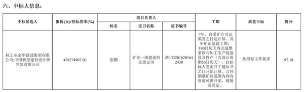 7月1日,核工業(yè)金華集團(tuán)建設(shè)有限公司、中國新型建材設(shè)計(jì)研究院有限公司成功中標(biāo)浙江省金華市婺城區(qū)雅畈鎮(zhèn)竹園村礦地綜合開發(fā)利用項(xiàng)目-普通建筑石料礦(凝灰?guī)r)礦山設(shè)計(jì)施工采購、開采及砂石加工總承包項(xiàng)目,中標(biāo)價近4.8億元。