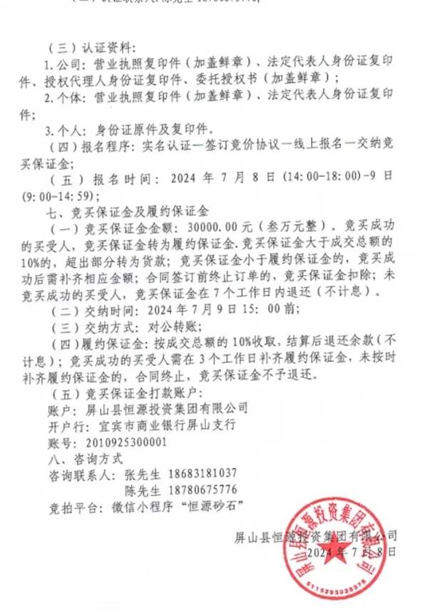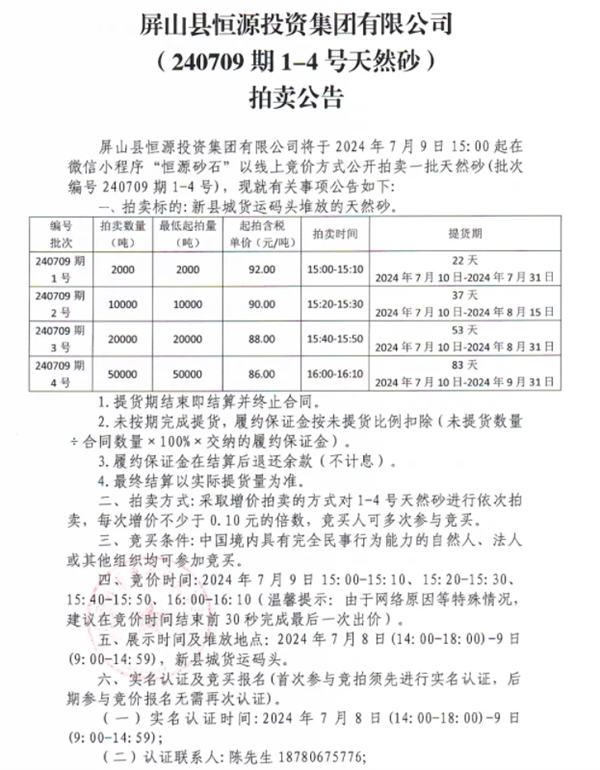7月8日,四川省宜賓市屏山縣恒源投資集團(tuán)發(fā)布線上競價(jià)方式公開拍賣一批天然砂公告。公告指出,該公司將采取增價(jià)拍賣的方式對(duì)1-4號(hào)天然砂進(jìn)行依次拍賣,起拍量2000噸-5萬噸不等,起始單價(jià)86元/噸-92元/噸不等,提貨期22-83天不等。