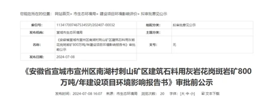 7月8日,安徽省宣城市生態(tài)環(huán)境局發(fā)布宣州區(qū)南湖村刺山礦區(qū)建筑石料用灰?guī)r花崗斑巖礦800萬噸/年建設項目環(huán)評批前公示。