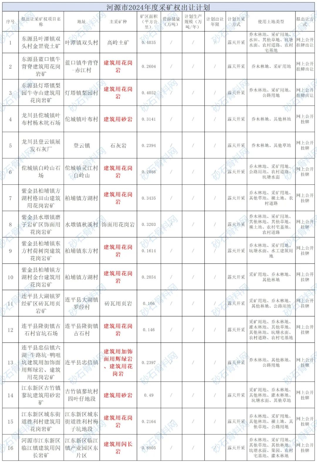 近日,廣東河源市自然資源局發(fā)布河源市2024年度采礦權(quán)出讓計劃公告,共計劃出讓礦權(quán)16宗,其中,12宗為建筑用花崗巖、閃長巖等砂石類采礦權(quán),儲量、出讓年限等尚未公示。