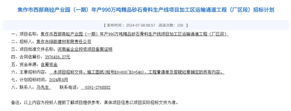 日前,河南焦作市西部商砼產(chǎn)業(yè)園(一期)年產(chǎn)990萬(wàn)噸精品砂石骨料生產(chǎn)線(xiàn)項(xiàng)目加工區(qū)運(yùn)輸通道工程(廠(chǎng)區(qū)段)計(jì)劃于8月公開(kāi)招標(biāo)。