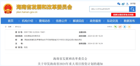 今年2月海南省發(fā)布《海南省2024年重大項目投資計劃表》,2024年安排省重大正式項目295個,總投資7744億元,年度計劃投資1255億元。此外,安排省級112個預(yù)備項目,總投資3334億元,以應(yīng)對海南自由貿(mào)易港的高質(zhì)量發(fā)展需求。重大項目加預(yù)備項目共計407個,總投資11078億!