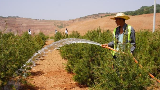 礦山生態(tài)修復(fù)治理區(qū)內(nèi),工人為白皮松澆水。韓章云 攝