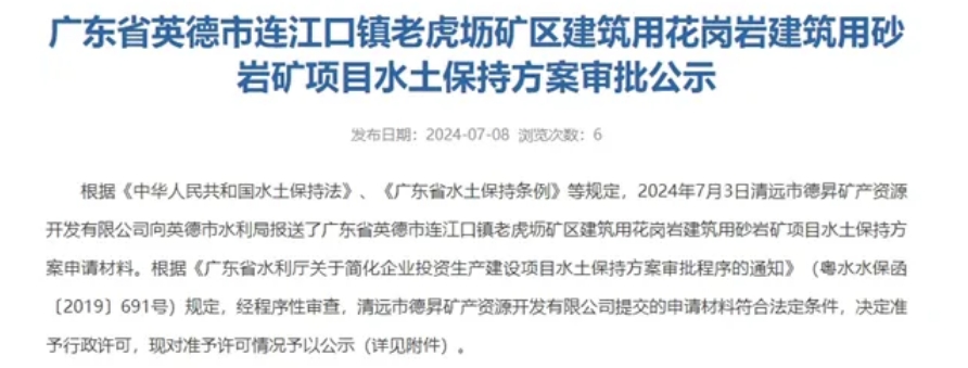 2024年7月8日,廣東清遠英德市水利局發(fā)布廣東英德連江口鎮(zhèn)老虎壢礦區(qū)建筑用花崗巖建筑用砂巖礦項目水土保持方案通過審批公告。該項目總投資5.64億元,設(shè)計總生產(chǎn)規(guī)模320萬方/年,施工工期6個月,建設(shè)單位為清遠市德昇礦產(chǎn)資源開發(fā)有限公司。