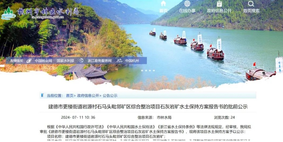浙江杭州市林業(yè)水利局日前發(fā)布《建德市更樓街道巖源村石馬頭毗鄰礦區(qū)綜合整治項目石灰?guī)r礦水土保持方案報告書的批前公示》。