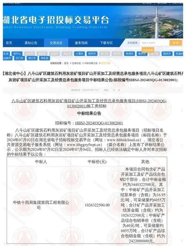 據(jù)悉,湖北省京山市八斗山礦區(qū)建筑石料用灰?guī)r礦項目礦山開采加工及經營總承包服務項目由中鐵十四局第四工程公司中標,總面積815畝,可采儲量6055萬噸,年設計開采500萬噸,合同額34.5億,開采年限13.1年(含基建期1年)。涵蓋開采加工及包銷。