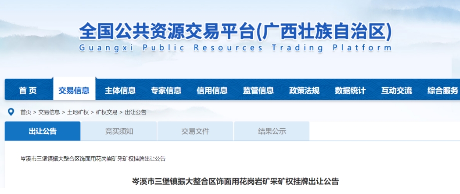 據(jù)悉,本次出讓的岑溪市三堡鎮(zhèn)振大整合區(qū)飾面用花崗巖礦屬于整合