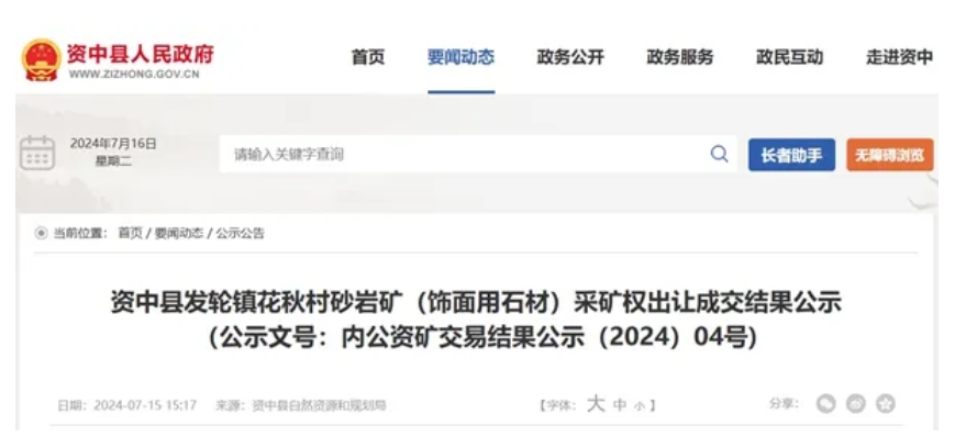 四川省內(nèi)江市資中縣發(fā)輪鎮(zhèn)花秋村砂巖礦(飾面用石材)采礦權(quán)出讓結(jié)果公布,當?shù)貒笞庸举Y中縣船城礦業(yè)有限責任公司溢價182%競得。該礦起始價為1584.43萬元,成交價為4464.43萬元,資源成本約19.06元/噸。