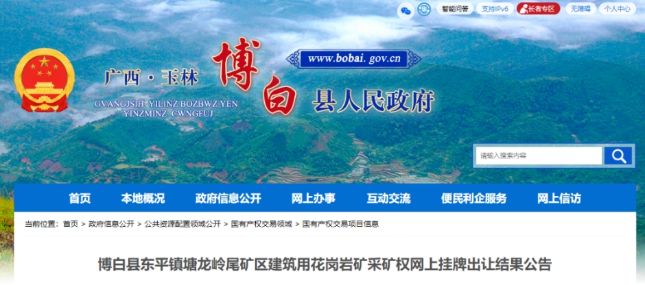 近日,廣西省博白縣天盛礦業(yè)有限公司以底價12867.43萬元競得博白縣東平鎮(zhèn)塘龍嶺尾礦區(qū)建筑用花崗巖礦采礦權(quán),該礦資源儲量為6357萬噸(其中可利用建筑用花崗巖5362.08萬噸,可利用半風化礦石資源量為995.39萬噸),生產(chǎn)規(guī)模為284萬噸/年,采礦權(quán)出讓期限為20年。