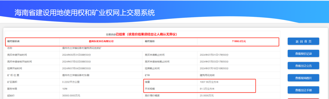 近日,海南儋州東發(fā)采石有限公司以71950萬(wàn)元競(jìng)得儋州市蘭洋鎮(zhèn)后影村建筑用花崗巖礦。據(jù)悉該礦權(quán)底價(jià)30000萬(wàn)元,經(jīng)過(guò)1385輪報(bào)價(jià)最終以超出31950萬(wàn)元成交,溢價(jià)139%。礦區(qū)資源儲(chǔ)量1007.9萬(wàn)方,開(kāi)采規(guī)模81.3萬(wàn)方,出讓年限10年,單價(jià)約為71.38元/方。這將成為2024年最高的競(jìng)得單價(jià)。