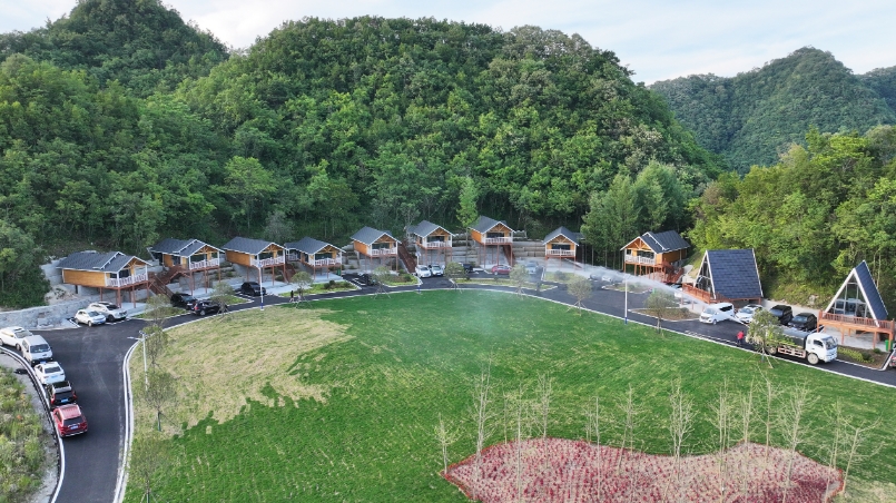 放眼望去,四季綠草樹木及景觀花卉五彩繽紛,健身步道貫穿其中。20幢木屋民宿依山而建,70多畝大棚一字排開,昔日的露天采礦場(chǎng)“變身”度假勝地。