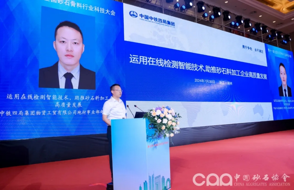 中鐵四局集團(tuán)物資工貿(mào)有限公司地材事業(yè)部部長(zhǎng)梁長(zhǎng)偉作題為《運(yùn)用在線檢測(cè)智能技術(shù),助推砂石料加工企業(yè)高質(zhì)量發(fā)展》的主題報(bào)告。講述不到100天在高原上建設(shè)智能綠色砂石加工場(chǎng)的前前后后,詳解自動(dòng)化控制等技術(shù)的應(yīng)用,以及對(duì)加工流程的高效監(jiān)控、精準(zhǔn)控制和智能化質(zhì)量管理等。