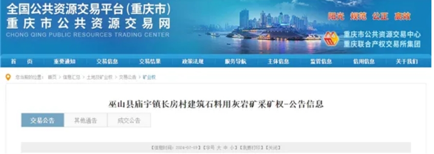 近日,重慶市公共資源交易網(wǎng)發(fā)布巫山縣廟宇鎮(zhèn)長房村建筑石料用灰?guī)r礦采礦權(quán)掛牌出讓公告。該礦資源儲量4524.1萬噸,生產(chǎn)規(guī)模180萬噸/年,出讓年限13.9年,起始價近1.2億元。網(wǎng)上拍賣時間2024年8月16日10時。