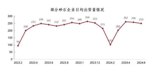 根據(jù)對重點砂石企業(yè)監(jiān)測顯示,4~6月,部分砂石企業(yè)日均出貨量分別為262萬噸/日、258萬噸/日、250萬噸/日。
