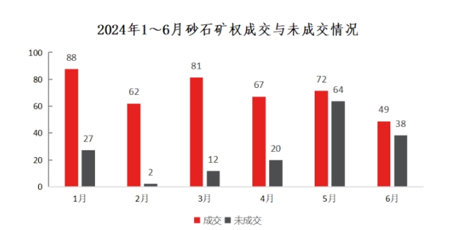 砂石礦權總體投放過多,遠超市場需求,砂石企業(yè)礦權競拍更加理性,砂石礦權流拍現(xiàn)象頻現(xiàn)。今年上半年,我國砂石礦權成交418宗,未成交163宗,將近三成砂石礦權流拍、終止或中止。(說明:上圖中,5月、6月未成交數(shù)量較多一個主要原因是,眾多新掛牌礦權成交周期還沒有結束)