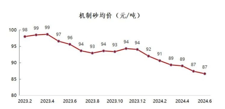 2024年6月,我國機制砂均價87元/噸,同比下降9.4%;天然砂均價126元/噸,同比下降6.8%。