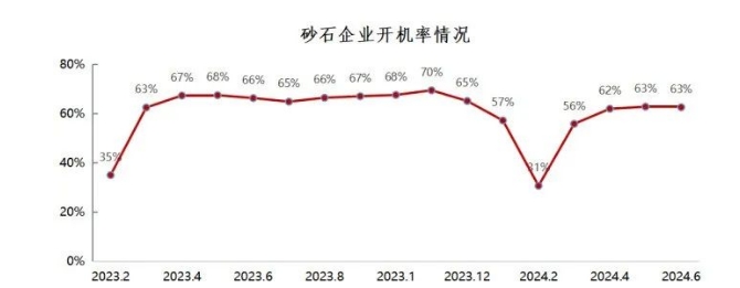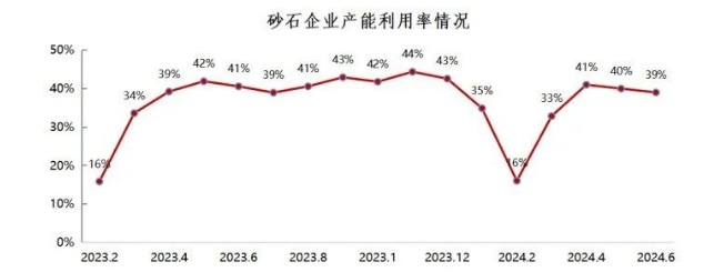 2024年上半年,我國砂石企業(yè)產(chǎn)能利用率和開機率整體低于去年同期水平。二季度雖然開機率和產(chǎn)能利用率較一季度有所提升,但是整體來看,仍處于較低水平。4~6月砂石企業(yè)產(chǎn)能利用率各月分別為35%、16%、33%,開機率各月分別為41%、40%、39%。