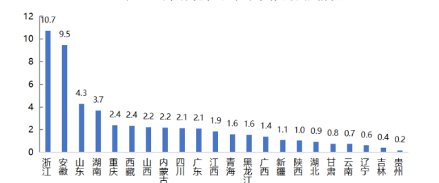 新設礦權出讓成交均價方面,由于各地政府對砂石礦權出讓的調(diào)控力度和競買人參與競拍的競爭情況以及礦區(qū)位置等不同,我國各省份新設礦權出讓成交均價差異較大。浙江新設砂石采礦權出讓成交均價為10.7元/噸,價格居全國首位;安徽新設砂石采礦權出讓成交均價為9.5元/噸,居第二位;重慶和山東、湖南、西藏、山西、內(nèi)蒙古、四川、廣東、江西、青海、黑龍江、廣西、新疆、陜西新設砂石采礦權出讓成交均價在1~5元/噸之間;湖北、甘肅、云南、遼寧、吉林、貴州新設砂石采礦權出讓成交均價在1元/噸以內(nèi)。