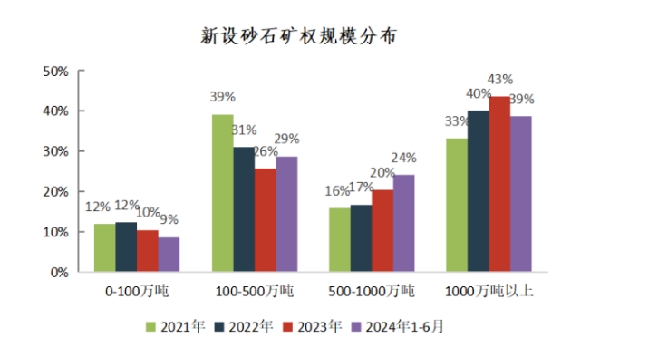 新設砂石礦權中,資源儲量在100萬~500萬噸之間的中型砂石礦權、資源儲量在500萬~1000萬噸之間的大型砂石礦權,占比分別提升至29%、24%,占比均較2023年有所提升;資源儲量大于1000萬噸的超大型砂石礦權、資源儲量在100萬噸以下的小型砂石礦權占比分別為39%、9%,超大型、小型砂石礦權占比均較2023年有所下降。