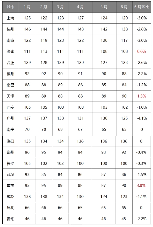 2024年6月,從全國19個重點城市砂石市場價格變化情況來看,重慶和天津、濟南3城市砂石價格環(huán)比出現(xiàn)上漲,其中重慶漲幅最大,為3.8%;上海和廣州、南京、合肥、杭州、福州、貴陽、武漢、南昌、成都、西安、鄭州、長沙13城市砂石價格出現(xiàn)下跌,其中廣州跌幅最大,為4.1%;南寧、??凇⒗ッ鲀r格環(huán)比持平。