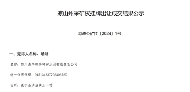 據(jù)了解,該礦是在原已設(shè)礦業(yè)權(quán)整體規(guī)劃后重新出讓的礦業(yè)權(quán),競得人四川嘉華錦屏特種水泥有限責(zé)任公司亦是該礦的原礦業(yè)權(quán)人。該公司成立于2005年10月,注冊資本1.8億元,是天山材料的二級子公司。