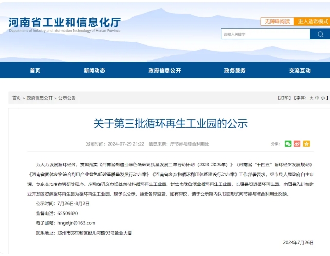 此次擬確定的省級循環(huán)再生工業(yè)園共有4個,記者了解到,截至目前,我省已先后公布了兩批循環(huán)再生工業(yè)園。第一批為滑縣能源新材料循環(huán)再生工業(yè)園、焦作市中站區(qū)新能源電池循環(huán)利用產(chǎn)業(yè)園、長葛循環(huán)經(jīng)濟產(chǎn)業(yè)園,第二批是鞏義市鋁銅新材料循環(huán)再生工業(yè)園、洛陽循環(huán)經(jīng)濟園區(qū)、舞鋼市靜脈產(chǎn)業(yè)園、延津縣資源循環(huán)再生園區(qū)、襄城縣循環(huán)再生工業(yè)園、濟源市思禮循環(huán)經(jīng)濟產(chǎn)業(yè)園。