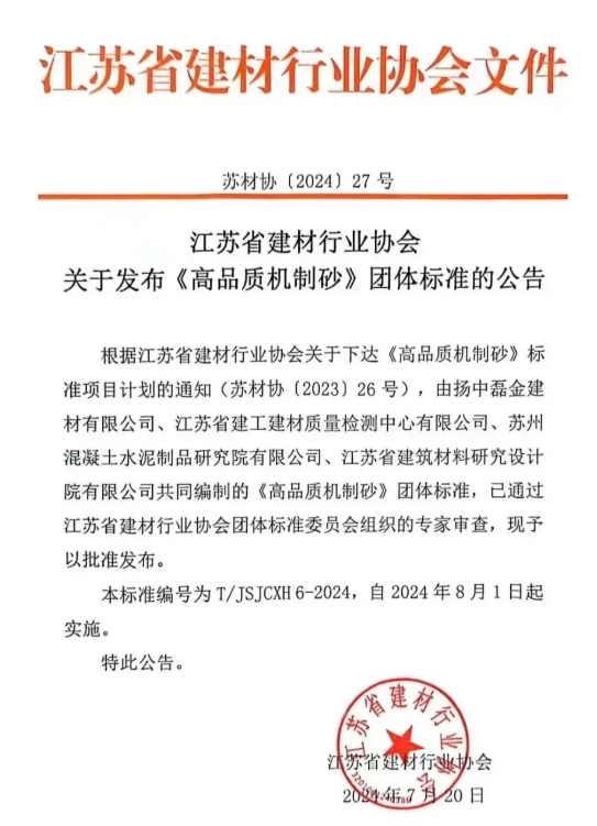 近日,由揚(yáng)中磊金建材有限公司、江蘇省建工建材質(zhì)量檢測中心有限公司、蘇州混凝土水泥制品研究院有限公司、江蘇省建筑材料研究設(shè)計(jì)院有限公司共同編制的《高品質(zhì)機(jī)制砂》團(tuán)體標(biāo)準(zhǔn)正式發(fā)布。標(biāo)準(zhǔn)編號(hào)為T/JSJCXH 6-2024,自2024年8月1日起實(shí)施。