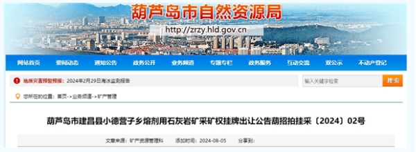 8月5日,遼寧省葫蘆島市自然資源局發(fā)布昌縣小德?tīng)I(yíng)子鄉(xiāng)熔劑用石灰?guī)r礦掛牌出讓公告。該礦設(shè)計(jì)利用總資源儲(chǔ)量8345.27萬(wàn)噸,生產(chǎn)規(guī)模300萬(wàn)噸/年,出讓年限26年8個(gè)月,起始價(jià)8831.19萬(wàn)元。掛牌報(bào)價(jià)時(shí)間2024年9月3日-2024年9月18日。