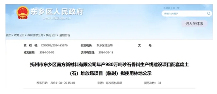 江西省撫州市東鄉(xiāng)區(qū)南方新材料有限公司年產能980萬噸砂石骨料生產線建設項目配套廢土(石)堆放場項目(臨時)擬使用林地公示。