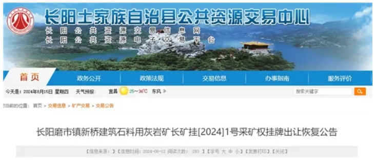 8月12日,湖北省長陽公共資源交易信息網發(fā)布磨市鎮(zhèn)新橋建筑石料用灰?guī)r礦采礦權掛牌出讓恢復公告。該礦為“凈礦”出讓,資源儲量8687萬噸,生產規(guī)模500萬噸/年,設計服務年限17年,本次出讓年限10年,起始價近1.05億元,前期投入成本共近2億元,資源價款約3.5元/噸。掛牌時間2024年9月11日至2024年9月27日。