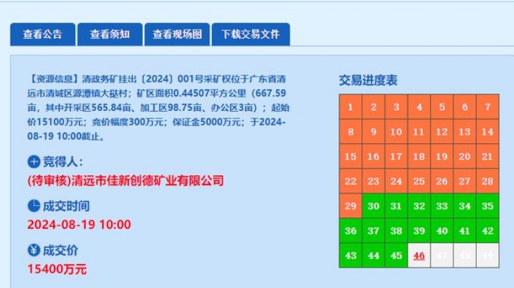清遠(yuǎn)市佳新創(chuàng)德礦業(yè)有限公司以1.54億元競(jìng)得該項(xiàng)目礦權(quán)。據(jù)悉,清遠(yuǎn)市佳新創(chuàng)德礦業(yè)有限公司成立于2024年7月23日,所屬行業(yè)為非金屬礦采選業(yè),經(jīng)營(yíng)范圍許可項(xiàng)目包含非煤礦山礦產(chǎn)資源開(kāi)采、港口經(jīng)營(yíng)、道路貨物運(yùn)輸(不含危險(xiǎn)貨物)等。一般項(xiàng)目包含非金屬礦及制品銷售、礦物洗選加工、建筑用石加工、總質(zhì)量4.5噸及以下普通貨運(yùn)車輛道路貨物運(yùn)輸?shù)取?/div>