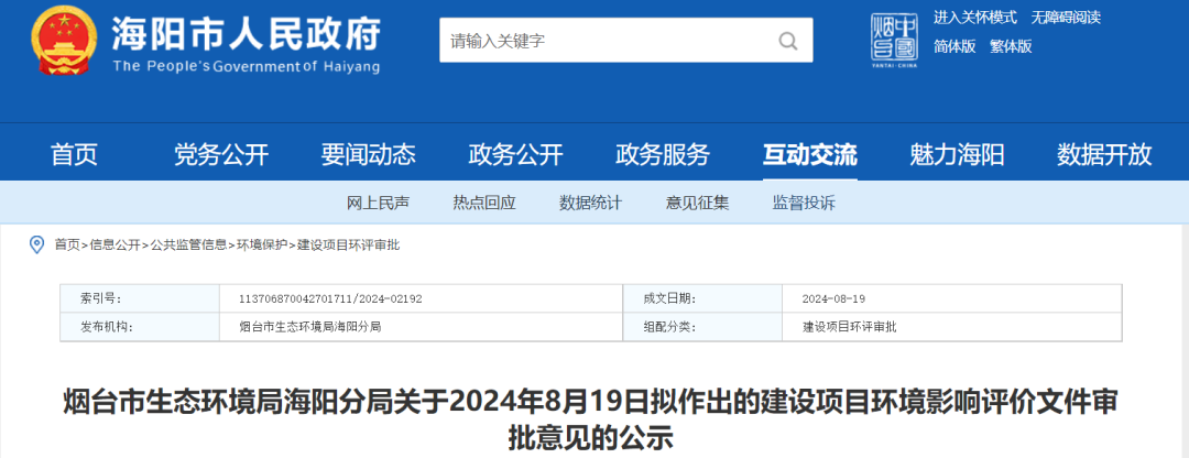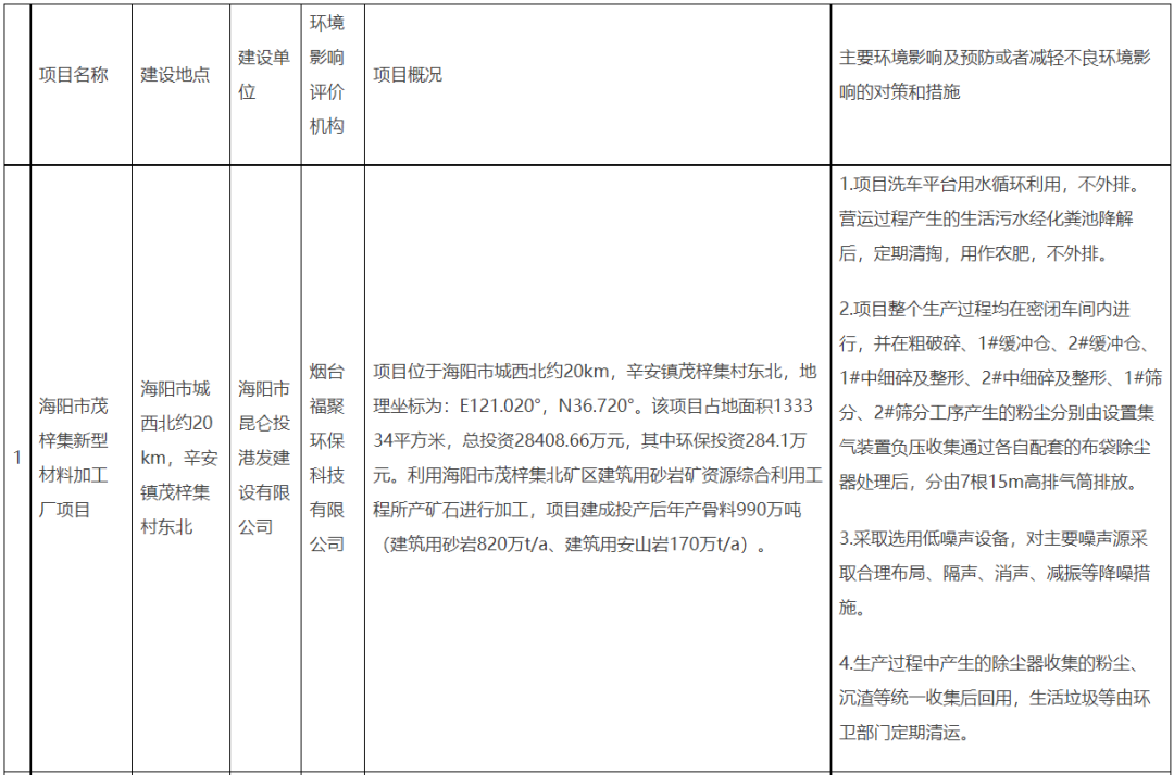 近日,山東煙臺(tái)市生態(tài)環(huán)境局發(fā)布擬對(duì)海陽(yáng)市茂梓集新型材料加工廠項(xiàng)目作出建設(shè)項(xiàng)目環(huán)境影響評(píng)價(jià)文件審批意見(jiàn)的公示。