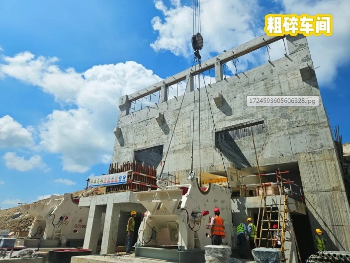 8月25日,中能建海南定安項(xiàng)目粗碎車間顎式破碎機(jī)吊裝到位,至此,定安項(xiàng)目粗碎車間、中碎車間、細(xì)碎及整形車間、制砂車間、篩分及水洗砂車間五大車間的主機(jī)設(shè)備全部吊裝到位。