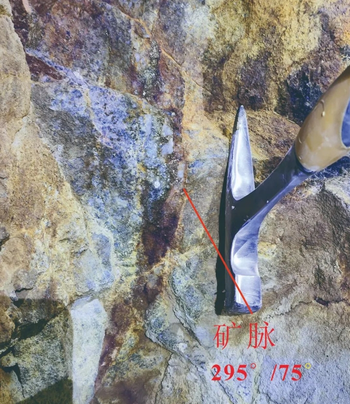 項目,通過系統(tǒng)調(diào)查評價工作,成功在礦業(yè)權(quán)空白區(qū)域新發(fā)現(xiàn)2條關(guān)鍵構(gòu)造蝕變帶,并識別出4條金多金屬的構(gòu)造蝕變巖型礦脈。脈體長300-1300米,寬0.5-2米,發(fā)育有黃鐵礦化、黃銅礦化、方鉛礦化、螢石礦化等特征,樣品分析測試結(jié)果顯示,金品位0.56-40.6克/噸,鉛品位0.7%-26.09%。