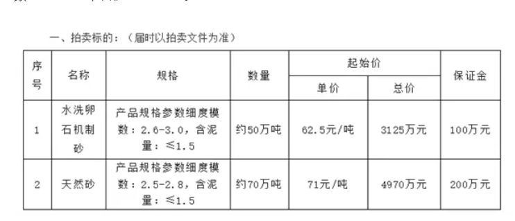 其中,拍賣水洗卵石機(jī)制砂資源約50萬噸,起始單價62.5元/噸,總價3125萬元,要求產(chǎn)品規(guī)格參數(shù)細(xì)度模數(shù):2.6-3.0,含泥量:≤1.5;