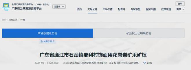 據了解,本次掛牌出讓采礦權,屬非“凈礦”出讓。礦區(qū)范圍內曾存在廣東中匯石材有限公司石頸那利高嶺飾面用花崗巖礦,根據廣東中匯石材有限公司提交的采礦權注銷登記申請,廉江市自然資源局已于2024年7月26日準予注銷。競得人需支付原采礦人所持部分資產市場價值為1118.96萬元。