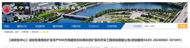 8月28日,湖北省咸寧市公共資源電子交易平臺發(fā)布咸安區(qū)黃鷹巖礦區(qū)年產(chǎn)900萬噸建筑石料用灰?guī)r礦露天開采工程報建公告,或?qū)⑦M(jìn)行公開招標(biāo)。