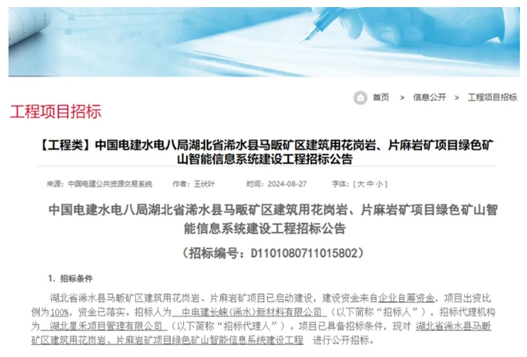 日前,中電建公共資源交易系統(tǒng)發(fā)布中電建長崍(浠水)新材料有限公司湖北省浠水縣馬畈礦區(qū)建筑用花崗巖、片麻巖礦項目綠色礦山智能信息系統(tǒng)建設(shè)工程招標公告。投標截止時間2024年9月16日9時。