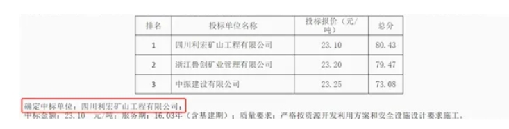 8月28日,山東省臨沂市蘭陵縣山河村礦區(qū)建筑石料用灰?guī)r礦開采加工項(xiàng)目開標(biāo)。中標(biāo)單位為四川利宏礦山工程有限公司,中標(biāo)金額23.1元/噸,服務(wù)期16.03年(含基建期),期間每5年根據(jù)市場價(jià)格進(jìn)行調(diào)整單價(jià)。