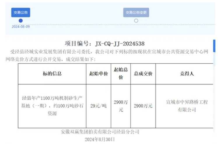 近日,安徽宣城市中昇路橋工程有限公司以2900萬元競得涇縣年產(chǎn)1100萬噸機(jī)制砂生產(chǎn)基地(一期),約100萬噸砂石資源,單價(jià)29元/噸。