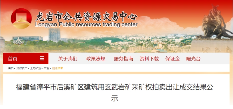近日,福建省漳平市后溪礦區(qū)建筑用玄武巖礦被廈門市明發(fā)爆破工程有限公司以2.2億元成功競得。該礦權(quán)起始價(jià)4188.51萬元,溢價(jià)425%,單價(jià)17元/方。